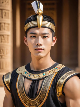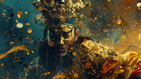 A golden graven image standing with a sword and rowel in his hand. Jada's multiple layers are placed on his head. He was standing on golden bases against a white backdrop