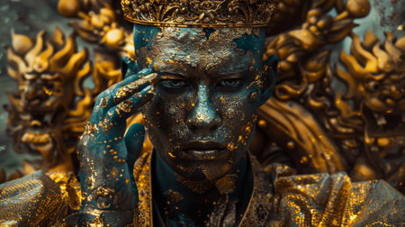 A man in a crown stares intensely at the camera, wearing intricate makeup on his face