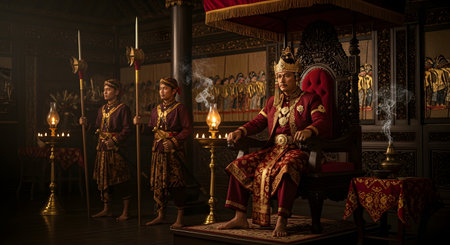 Roman Emperor wearing a diadem and holding a scepter in a palace chamber