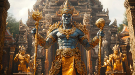 Detailed golden statue of a guardian figure, showcasing intricate craftsmanship in a serene temple setting. A symbol of protection and culture, ideal for travel themes.