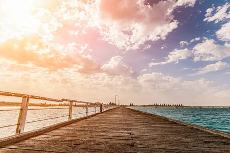 Wooden bridge sea in sunset. Sunlight and sun in evening.