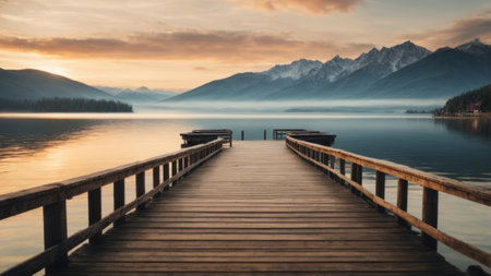 A captivating view of a wooden pier stretching into tranquil waters at sunset, with soft pastel skies and gentle reflections, creating a peaceful and calming atmosphere.