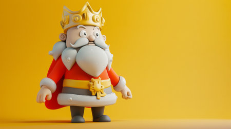 A man with a beard wears a golden crown and a shiny cape gazing upwards with a curious expression against a blue background.