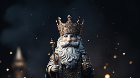 A wooden figurine of a king, wearing a crown and robes, sits on a throne against a textured grey background. The figurine is intricately carved and depicts the king with a serious expression, holding an object in his hands.