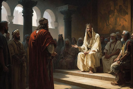 Roman Emperor converses with philosophers capturing intellectual atmosphere