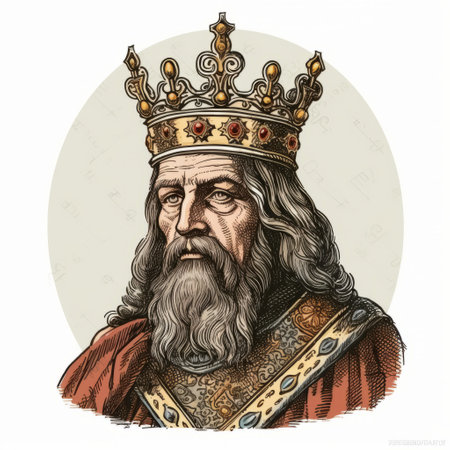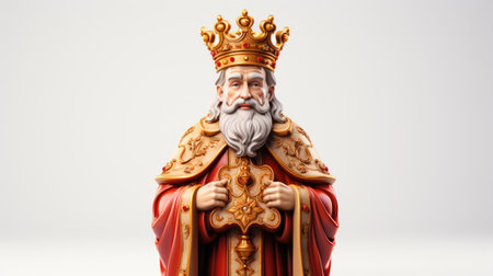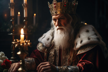 A majestic painting featuring an old, wise king adorned with a crown, exuding power and wisdom, against a blank backdrop.