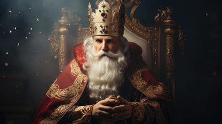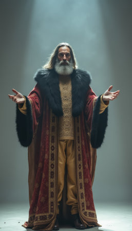A commanding man with a long beard stands in a dramatic pose, wearing an ornate robe adorned with fur. The ethereal lighting creates a powerful atmosphere, emphasizing his authority and wisdom, inviting viewers to witness a moment of grandeur and reverence