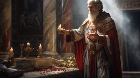 Roman priest conducts sacred ritual in temple adorned with frescoes and statues