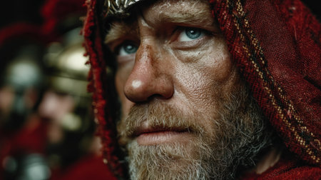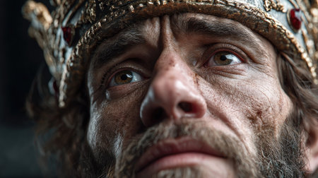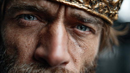 This stunning close-up portrait features a medieval warrior with a crown, showcasing intricate facial details that reflect strength, emotion, and resilience.