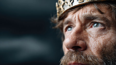 A striking close-up portrait of a man adorned with a golden crown, capturing intense emotion and strength through his piercing gaze and rugged features.