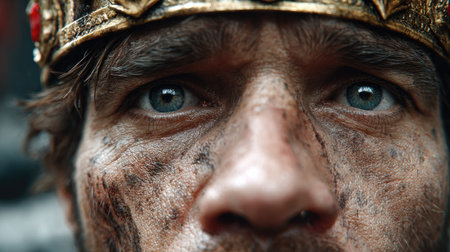 A striking close-up portrait of a battle-worn warrior adorned with a crown and dirty face, capturing raw emotion and fierce determination in his blue eyes.