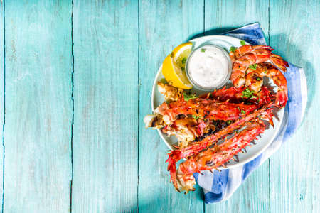 Assortment various barbecue Mediterranean grill food - fish, octopus, shrimp, crab, seafood, mussels, summer diet bbq party fest, with kebab, sauces, light blue sunne wooden background