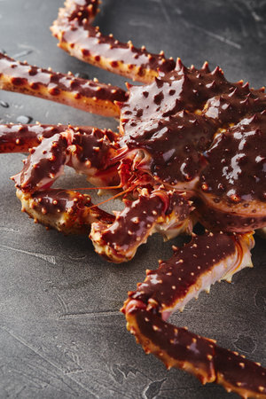 Closeup of big fresh tasty boiled crab legs on plate bowl