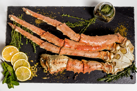 Vibrant king crab and assorted lemon slices arranged on a dark, rustic slate surface, cilantro, dark textured background, copy space, top view