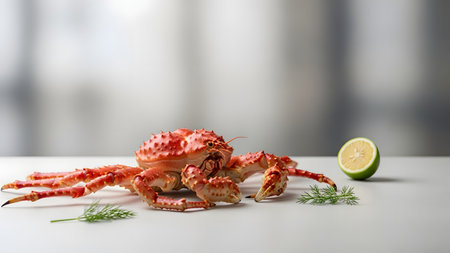 A whole cooked red king crab is displayed on a clean white surface accompanied by fresh dill and a lime half. The vibrant red shell and premium presentation highlight it as a luxury seafood ingredient.