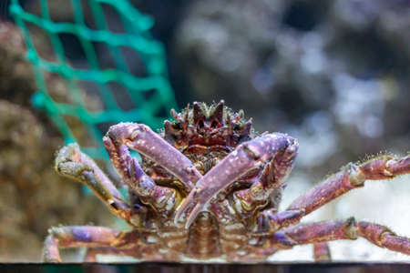 Live Japanese king crabs or Taraba at Hakodate Asaichi fish market Hokkaido. Top view live fresh seafood shot