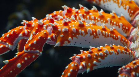 A macro close-up reveals the rugged texture of a red king crab shell, characterized by sharp spikes and white tips. The image highlights the intricate biological details and vibrant colors of the crustacean.