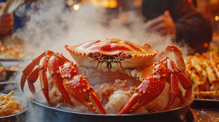 A stunning red crab is displayed amidst swirling steam and smoke, showcasing its vibrant color and freshness. Perfect for culinary themes and seafood presentations.