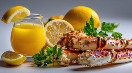 A vibrant arrangement featuring refreshing lemon juice, succulent crab legs, and fresh parsley, perfect for summer culinary creations and delicious meals.
