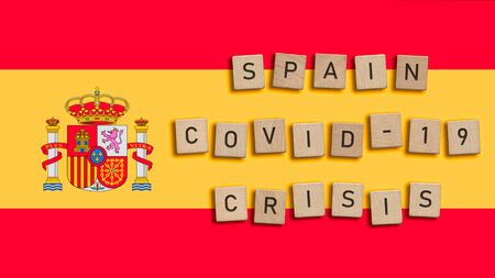Spain Covid 19 crisis written with wooden tiles over Spanish flag background. Respiratory syndrome coronavirus and Novel coronavirus 2019-nCoV. Virus Pandemic Spanish Concept