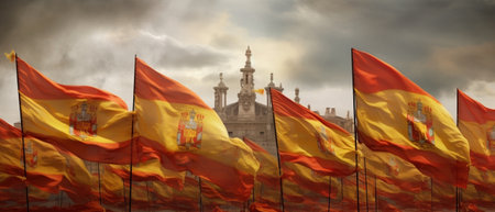 The Spanish national flag fluttering in the wind under a bright, clear sky with light clouds