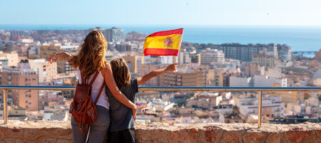 back view of family traveling in Spain with the flag- Travel, expatriat, adventure, road trip in Spain