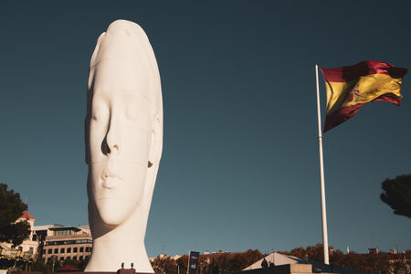 Madrid, Spain. November 22 2023 High huge white sculpture of young woman with eyes closed against blue sky. Masterpiece by artist Jaume Plensa on Colon square. Spanish flag on a wind. Dreamy girl face
