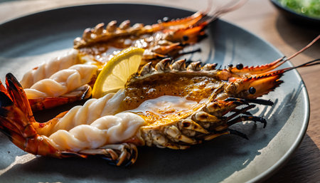 Grilled lobster tails garnished with herbs and butter on a white plate exquisite seafood dish closeup.