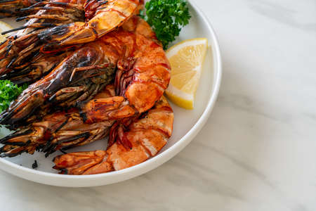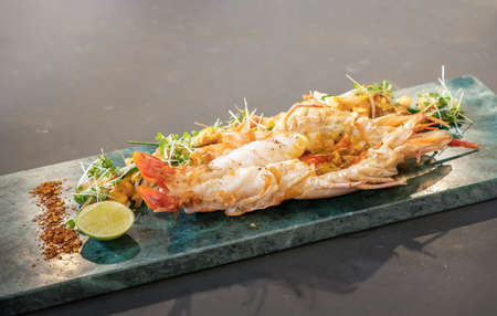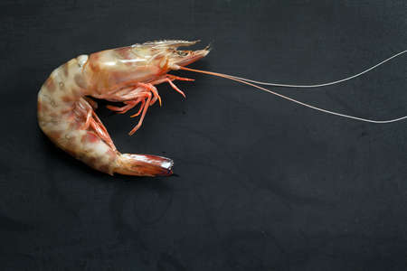 Photography of a grilled giant gambas prawn on slate background for food illustrations / Also called black tiger shrimp, this crustacean can reach a length of 17 cm