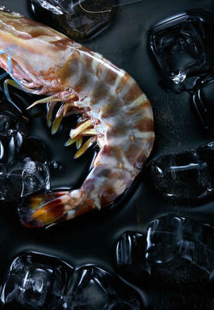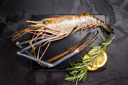 Raw giant river prawn shrimp on a marble board, inviting you to explore delicious recipes and seafood delights. black background. top view.
