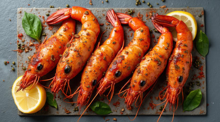 A mouthwatering display of grilled shrimp garnished with fresh lime and herbs, perfect for summer gatherings or gourmet dining experiences.