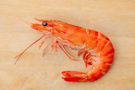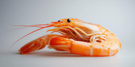 Shrimp exhibits bright orange and white shell showcasing texture in a minimalistic setting. Clean grey background highlights seafood. Concept of seafood restaurants, culinary arts, food photography.