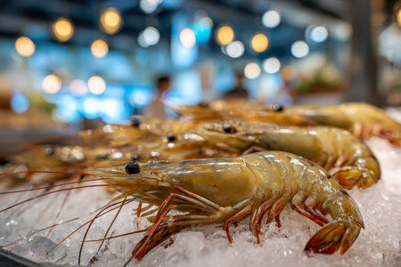 Freshly caught shrimp on ice, ready for sale at a seafood market, with their vibrant colors shining under display lights.