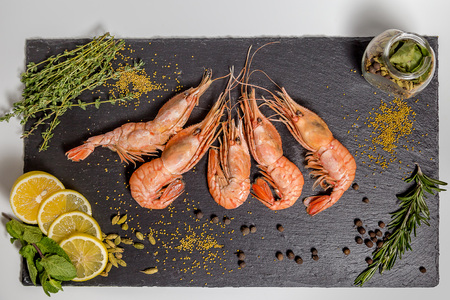 Tiger shrimp or langoustine boiled with spices and salt on a dark concrete background