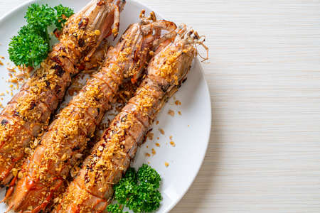 Top view, close up grilled fresh river shrimp with seafood sauce, slice garlic and mint leaves in white plate on wood table background is famous food in Thailand look delicious.