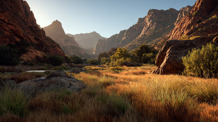 Scenic Mountain Valley with River and Tall Grass in Beautiful Light