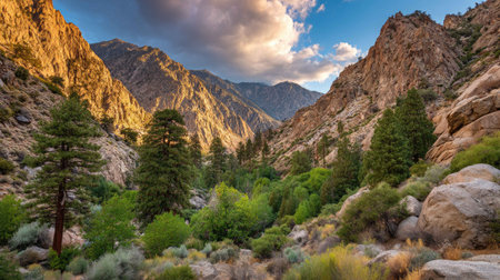 A scenic desert canyon featuring a rocky terrain, a stream, and mountains, showcasing the natural beauty of the rugged landscape. Clear details and vibrant colors enhance visual appeal. resolution use.