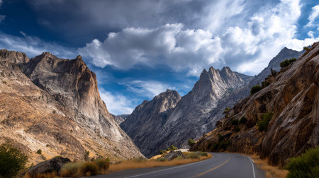 A picturesque scene of a winding road through rocky mountains during sunset. The vibrant colors blend with the tranquil valley, showcasing nature's beauty.
