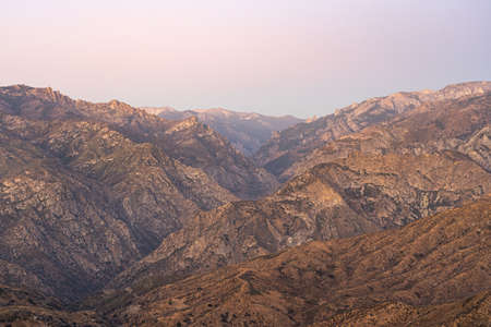A super panoramic view of a huge rocky mountains during a sunset with copy space and a clear blue sky