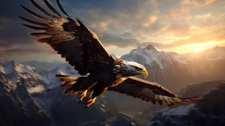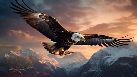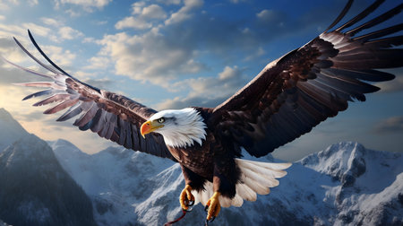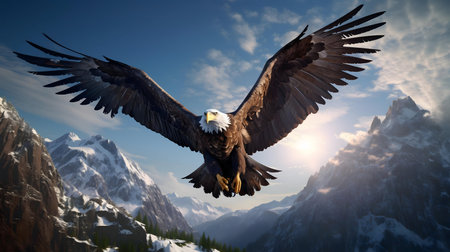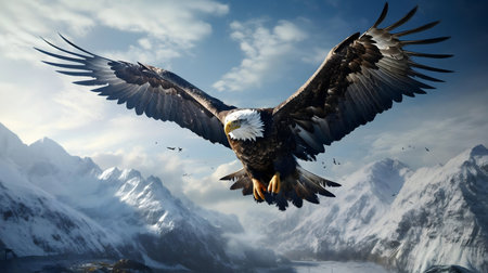 A majestic bald eagle in flight over a stunning snowy mountain range. A powerful image of nature's beauty.