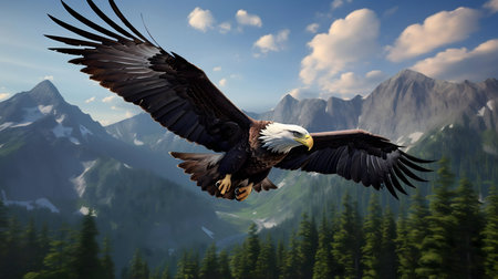 A bald eagle in majestic flight over a stunning mountain range and lake. Symbol of freedom.