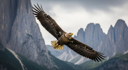 A bald eagle in majestic flight over a stunning mountain range.