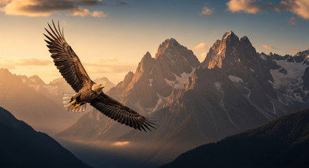 Eagle in flight over majestic snow-capped mountains during sunset.