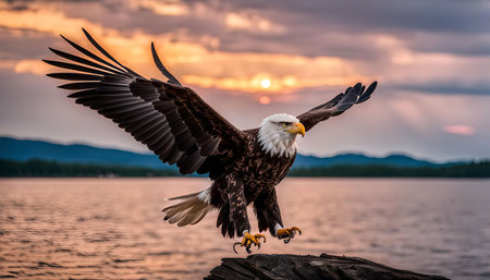A magnificent Bald Eagle with wings spread wide, prepares to land on a log near a serene lake at sunset. The vibrant colors of the sky create a breathtaking backdrop for this majestic bird.
