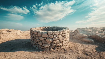 A picturesque scene featuring a circular stone well set against a vast desert landscape under a stunning blue sky and scattered clouds.