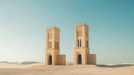 Twin towers rise amid the serene desert landscape under a clear blue sky, showcasing unique architectural features against rolling sand dunes.