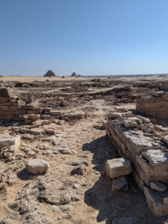 Visitors walk among the remnants of a historical site, surrounded by vast sandy terrain and distant pyramids, capturing a sense of adventure and discovery.
