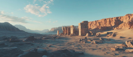 Desert landscape featuring ancient ruins in a hyper-realistic painting style