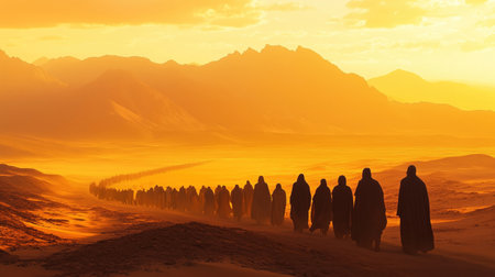 Dramatic mountainscape under an ethereal golden sunset sky with a silhouetted procession of figures in the distance creating a serene and atmospheric landscape scene