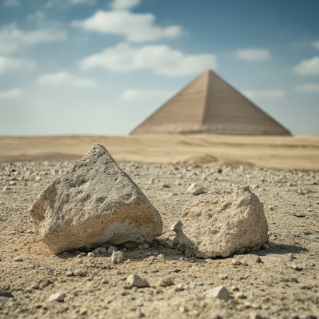 Two rocks in the foreground with the Great Pyramid of Giza rising majestically in the distance under a clear sky.